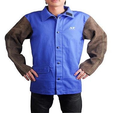 产品名称:蓝色阻燃布配炭啡色皮袖焊服 产品型号:AP-2530 产品类别:清凉款夹克 蓝色阻燃布配炭啡色皮袖焊服的袖子由抗火隔热的牛二层皮制成, 衣身由水洗防火阻燃布制成,安全舒凉; 皮袖采用杜邦Kevlar防火线双线缝制,增强耐用度; 前胸配置防焊飞溅保护条,防止烧焊飞溅物溅入衣内; 采用隔热绝缘纽扣,耐用又安全; 既能全臂抗烧焊物,又能保持身上清爽舒适。 尺寸:M,L,XL,XXL,XXXL