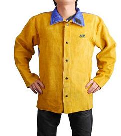 产品名称:金黄皮配蓝色阻燃背布焊服 产品型号:AP-3060 产品类别:清凉款夹克 金黄皮配蓝色阻燃背布焊服前幅选用耐磨隔热的牛二层皮,后幅配以水洗防火阻燃布料; 采用杜邦Kevlar防火线缝制;增强耐用度; 前幅配置防焊飞溅保护条,防止烧焊飞溅物溅入衣内; 耐热绝缘纽扣组合,方便穿卸,袖口配备可调纽扣,内置暗袋设计; 可翻式直立衣领,有效保护颈部; 防火阻燃棉布衣领,安全舒适又吸汗; 金黄皮配蓝色阻燃背布焊服专为焊工在炎热坏境下工作而设计。 尺寸:M,L,XL,XXL,XXXL